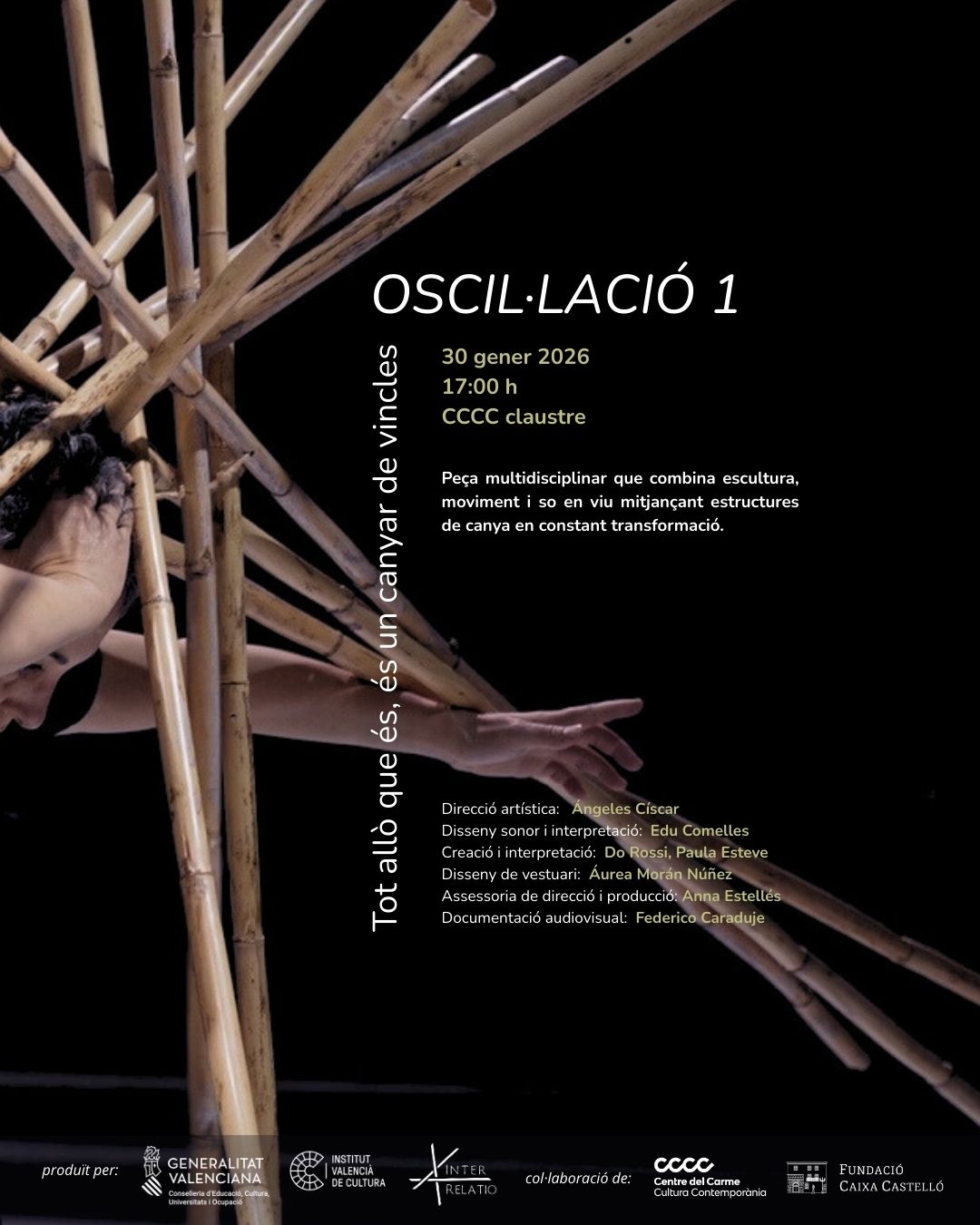 Oscil·lació 1. Todo aquello que es, es un cañaveral de vínculos, una performance multidisciplinar concebida específicamente para el Claustro Gótico del Centre del Carme Cultura Contemporània (CCCC) que integra escultura, movimiento y sonido en un dispositivo performativo vivo. La pieza transforma el espacio arquitectónico en un ecosistema efímero en el que el cuerpo humano, la materia natural y el sonido se influyen mutuamente, generando una experiencia sensorial en constante transformación.